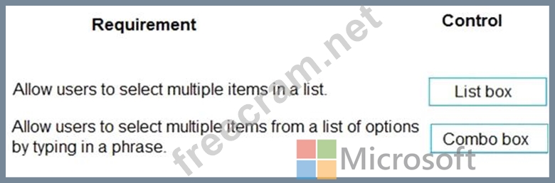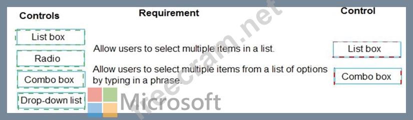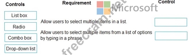 A List Box control always shows all available choices (unlike a Drop down control) and in which the user can choose more than one item at a time (unlike a Radio control).