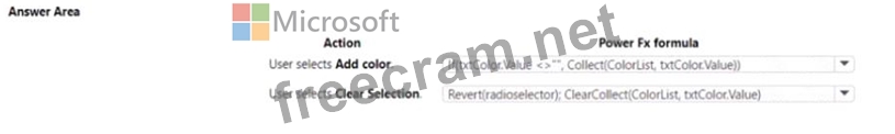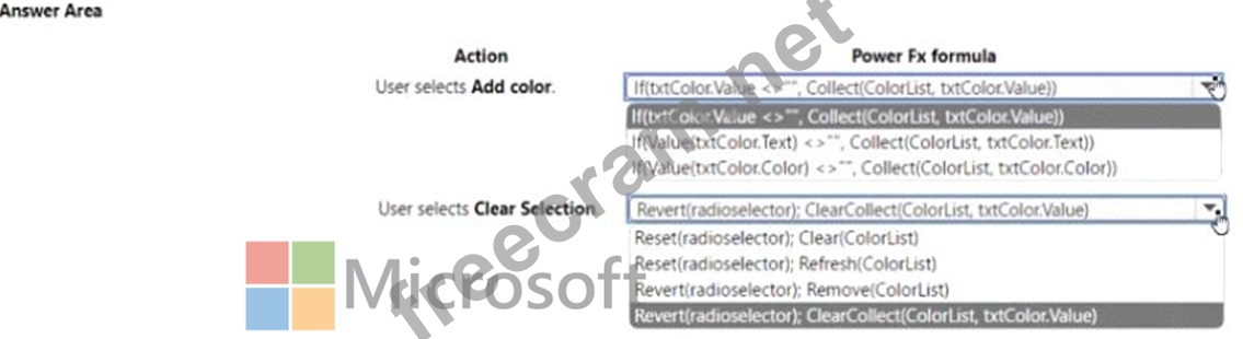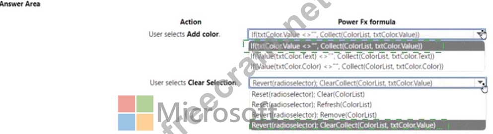 Which Power Fx formulas should you use? To answer, select the appropriate options in the answer area.