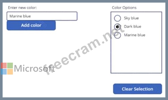Users enter color names into a text control and then select Add color to add the color to the Color options radio control. You must remove all the listed colors when a user selects Clear Selection You need to implement the functionality.