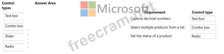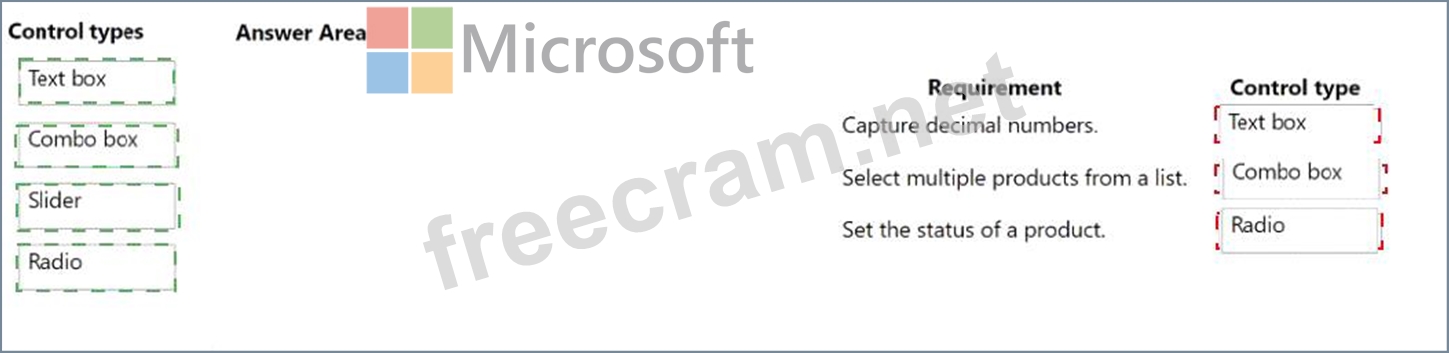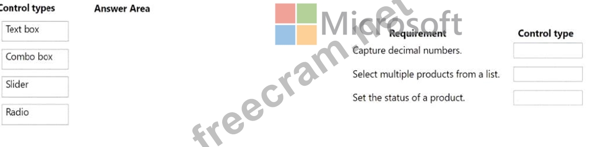 Which type of control should you use? To answer, drag the appropriate control types to the correct requirements. Each control type may be used once, more than once, or not at all. You may need to drag the split bar between panes or scroll to view content.