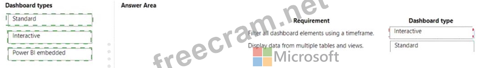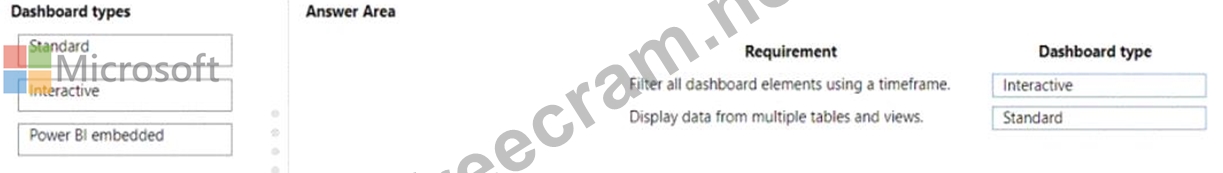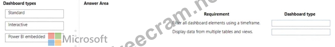 Which type of dashboard should you use? To answer, drag the appropriate dashboard types to the correct requirements. Each dashboard type may be used once, more than once, or not at all. You may need to drag the split bar between panes or scroll to view content.