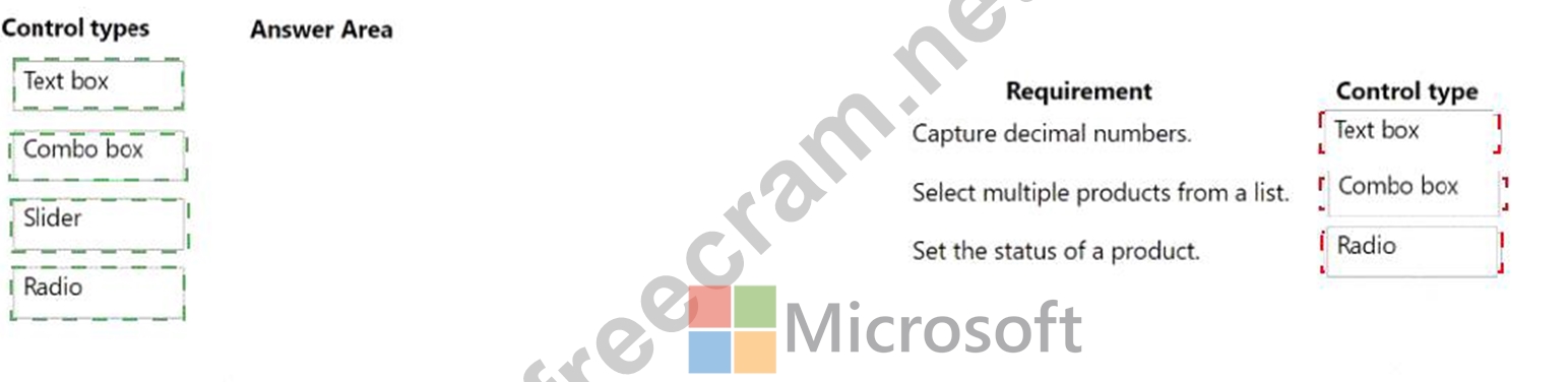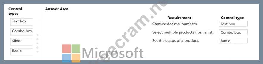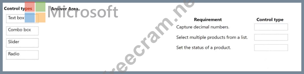 Which type of control should you use? To answer, drag the appropriate control types to the correct requirements. Each control type may be used once, more than once, or not at all. You may need to drag the split bar between panes or scroll to view content.