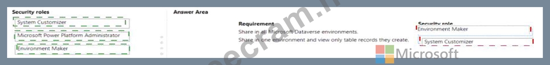 Which security role privilege should you grant for each requirement? To answer, drag the appropriate security roles to the correct requirements. Each security the may be used once, more than once, or not at all. You may need to drag the split bar between panes or scroll to view content.