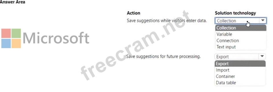 A product improvement suggestion has two parts: a topic and a comment. Attendees can enter up to 10 suggestions. You create a canvas app to allow attendees to enter suggestions. The wireless network connection inside the tradeshow is unreliable.