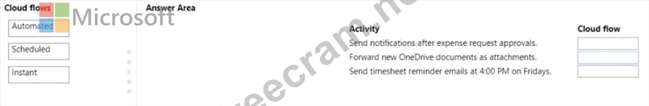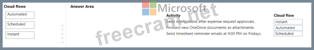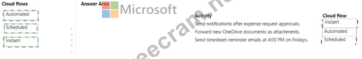 Which cloud flow types should you create? To answer, drag the appropriate cloud flows to the correct activities. Each cloud flow may be used once, more than once, or not at all. You may need to drag the split bar between panes or scroll to view content.