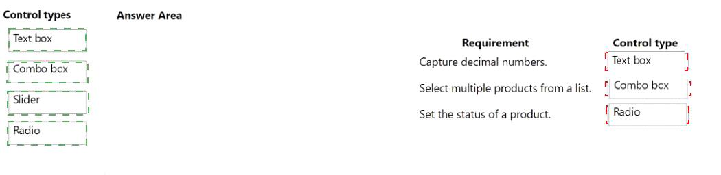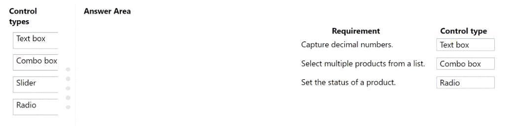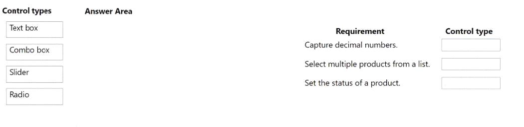 Which type of control should you use? To answer, drag the appropriate control types to the correct requirements. Each control type may be used once, more than once, or not at all. You may need to drag the split bar between panes or scroll to view content.
