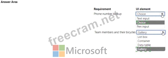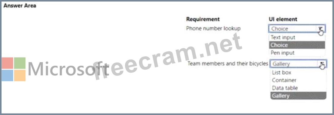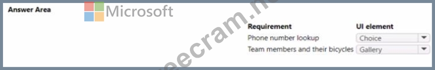 You need to modify the canvas app to display team and team member information, along with bicycle information Which Ul elements should you use for each requirement? To answer, select the appropriate options m the answer area NOTE: Each correct selection is worth one point.