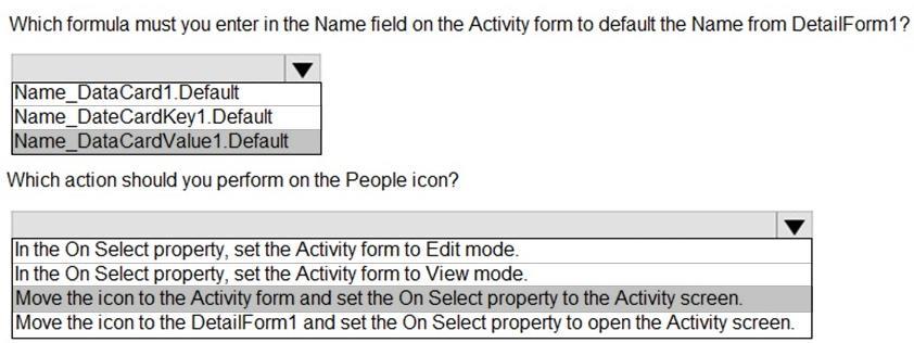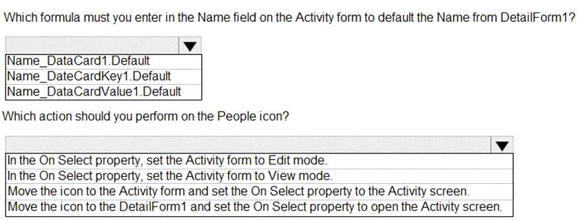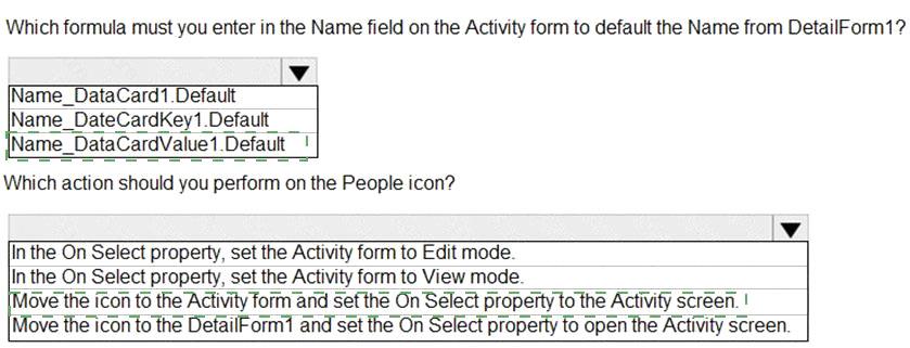 When you select the icon a new Activity form opens. You must set the value of the Name field on the new Activity form to the value of the name field from DetailForm1.