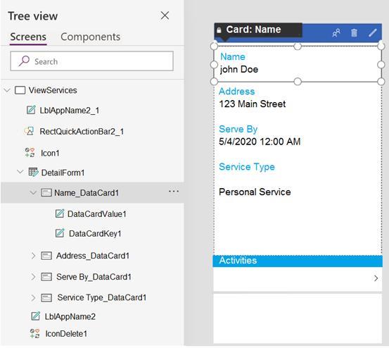 Using the Tree view, you navigate to the ViewServices screen. The screen contains a form named DetailForm1 that only contains Label controls. You add the People icon to the header of the ViewServices screen as shown below: