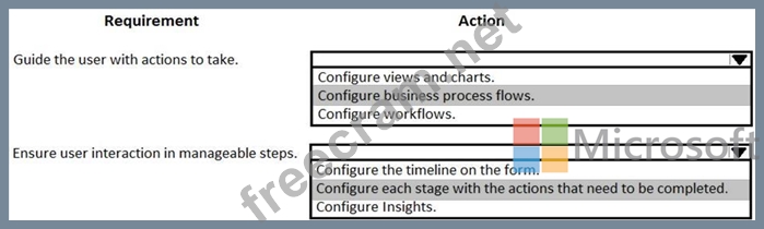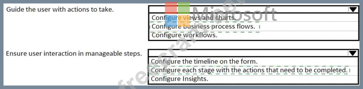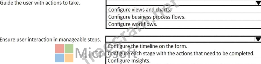 You are a Dynamics 365 Customer Engagement administrator. You create a new solution in Dynamics 365. You need to help end users understand which actions to take next and ensure that user interaction occurs in manageable steps. Which actions should you perform? To answer, select the appropriate options in the answer area. NOTE: Each correct selection is worth one point.