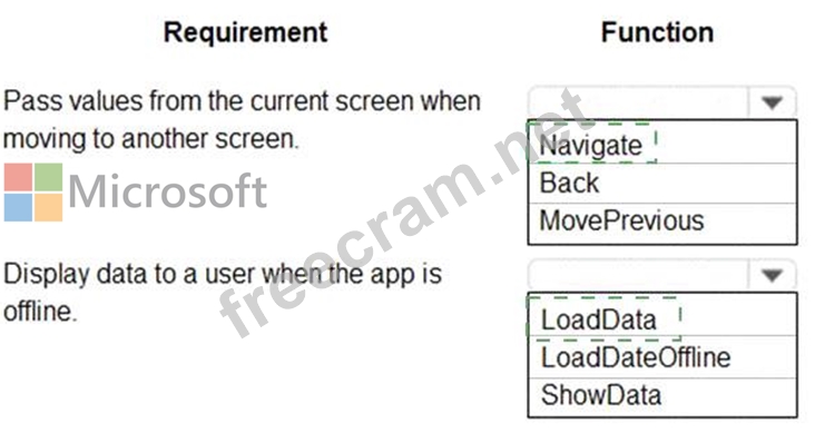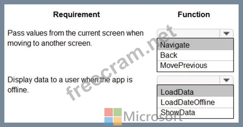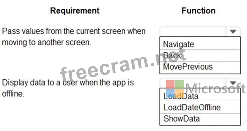 You are designing a canvas app that connects to Common Data Service. You need to configure the app to meet the requirements and ensure that the canvas app is available offline. What should you implement? To answer, select the appropriate options in the answer area. NOTE: Each correct selection is worth one point.