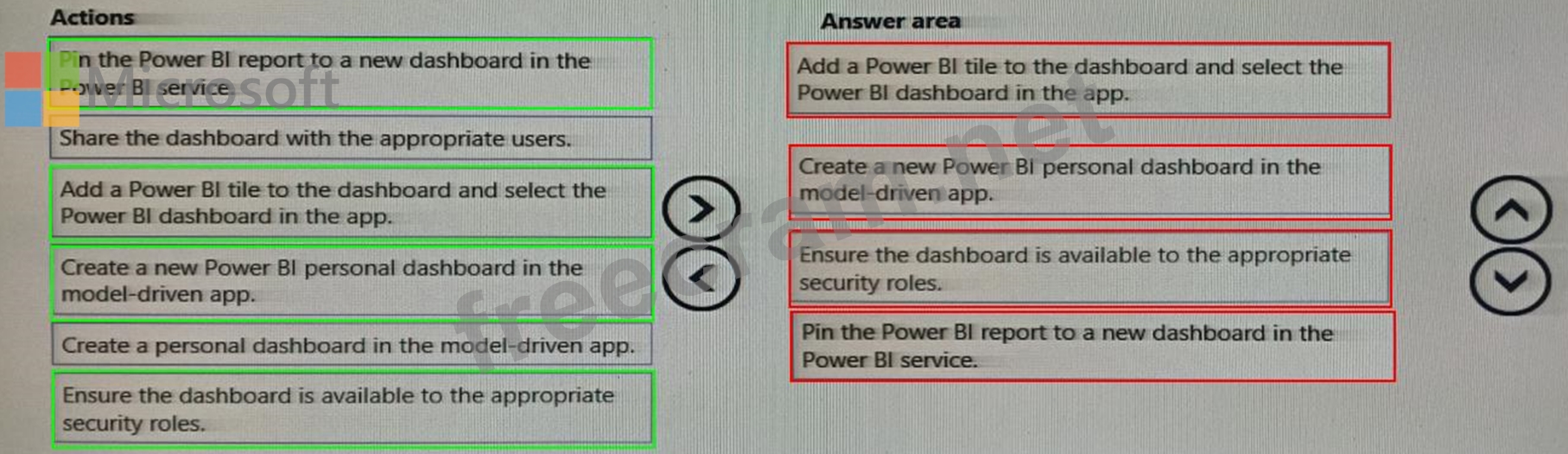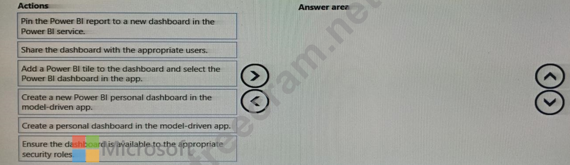 You create a report by using Power Bl Desktop and publish the report to the Power Bl service. You enable Power Bl visualization embedding in a model-driven app. You need to configure the model-driven app to display a Power Bi tile Which four actions should you perform in sequence? To answer, move the appropriate actions from the list of actions to the answer area and arrange them in the correct order.