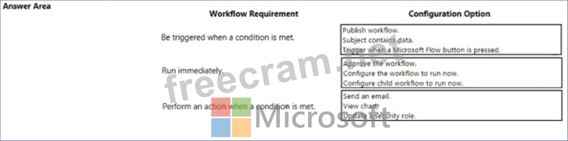 You ate a Dynamics 365 Customer Engagement administrator. You create workflows to automate business processes. You need to configure a workflow to meet the following requirements: