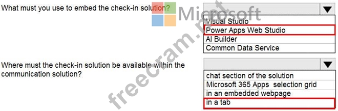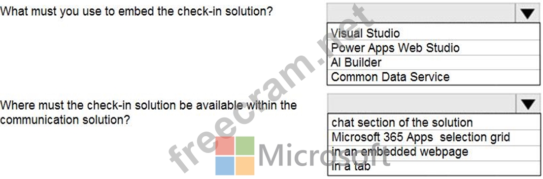 You need to embed the check-in solution into the communication solution. To answer, select the appropriate options in the answer area.