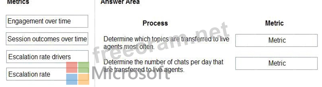 Which metrics should you use? To answer, drag the appropriate metrics to the correct processes. Each metric may be used once, more than once, or not at all. You may need to drag the split bar between panes or scroll to view content.