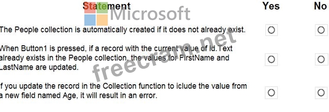 Collect(People, {Id:Id.Text, FirstName:FirstName.Text, LastName:LastName.Text}) For each of the following statements, select Yes if the statement is true. Otherwise, select No.