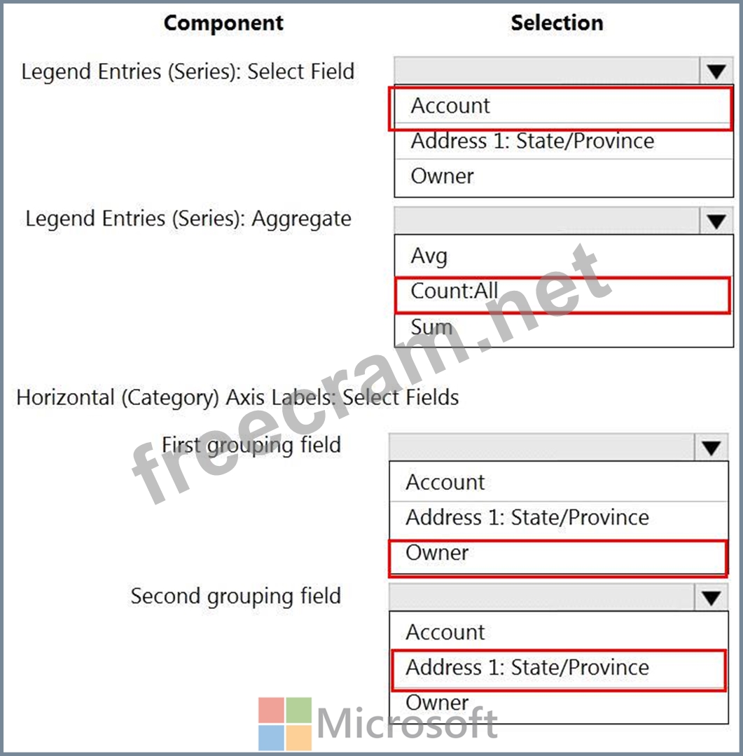 NOTE: Each correct selection is worth one point. The chart must display a count of accounts grouped by owner, and then display the accounts by Address 1 to State/Province for each owner.