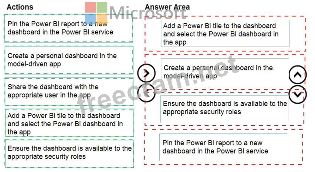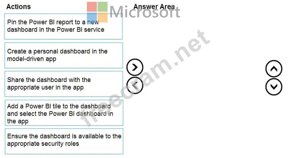 You create a report by using Power Bl Desktop and publish the report to the Power Bl service. You enable Power Bl visualization embedding in a model-driven app.