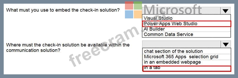 You need to embed the check-in solution into the communication solution. To answer, select the appropriate options in the answer area.