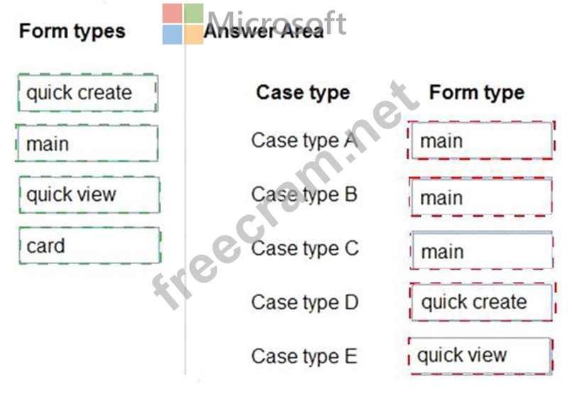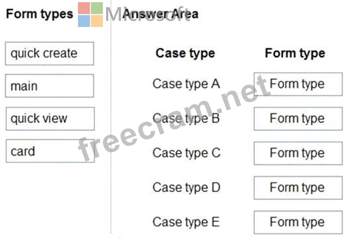 Which form types should you create? To answer, drag the appropriate form types to the meet the data entry requirements. Each source may be used once, more than once, or not at all. You may need to drag the split bar between panes or scroll to view content.