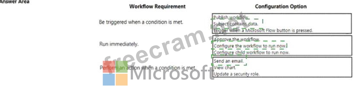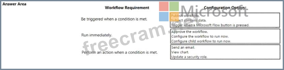 You ate a Dynamics 365 Customer Engagement administrator. You create workflows to automate business processes. You need to configure a workflow to meet the following requirements: