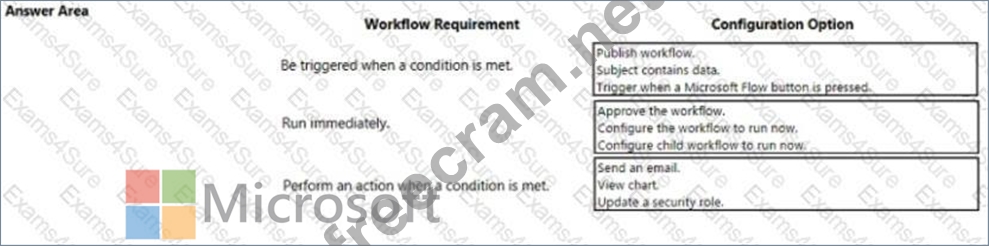 You ate a Dynamics 365 Customer Engagement administrator. You create workflows to automate business processes. You need to configure a workflow to meet the following requirements: