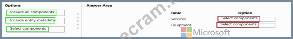 A company is updating a Power Apps solution that contains two tables named Sen/ices and Equipment. The company is creating a new solution to update the current solution for the following requirements: