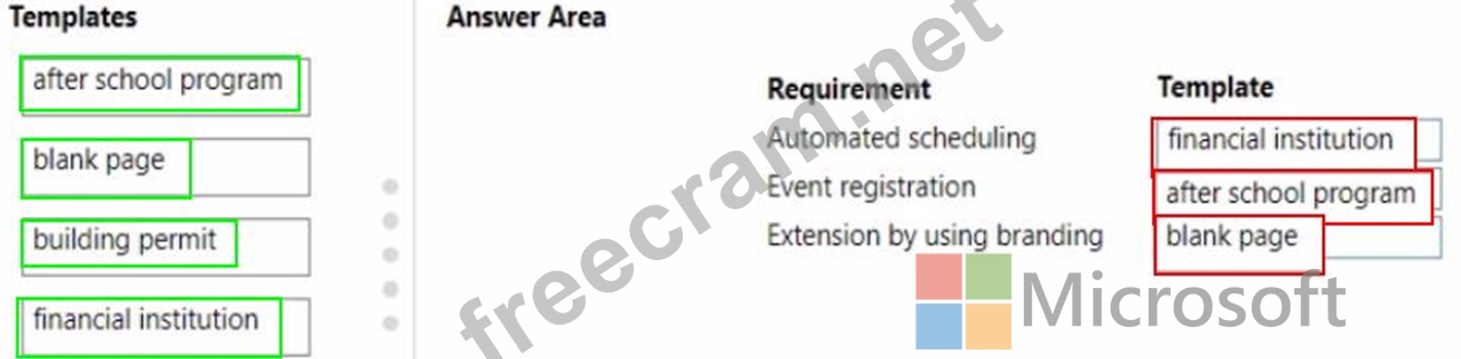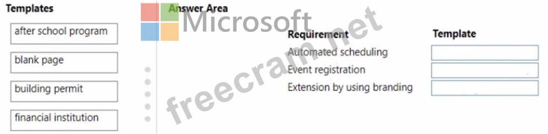 Which templates should you use? To answer, drag the appropriate templates to the correct requirements. Each template may be used once, more than once, or not at all. You may need to drag the split bar between panes or scroll to view content.