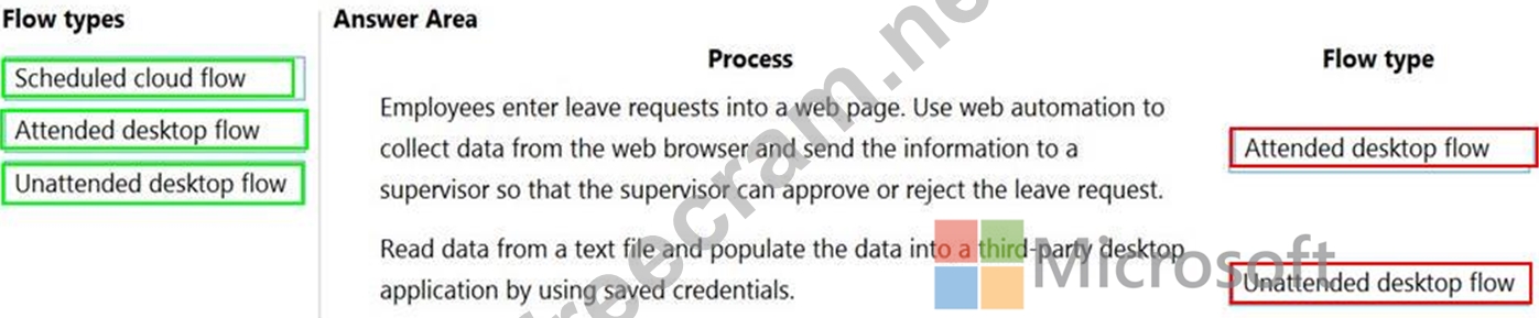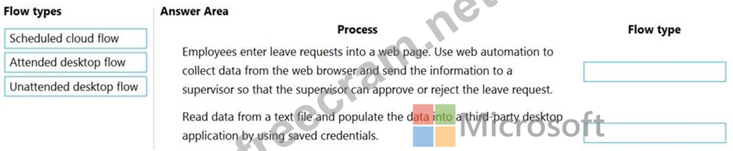 Which flow type should you use? To answer, drag the appropriate processes to the correct flow types. Each process may be used once, more than once, or not at all. You may need to drag the split bar between panes or scroll to view content.