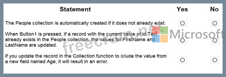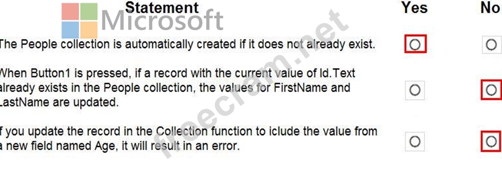 Collect(People, {Id:Id.Text, FirstName:FirstName.Text, LastName:LastName.Text}) For each of the following statements, select Yes if the statement is true. Otherwise, select No.
