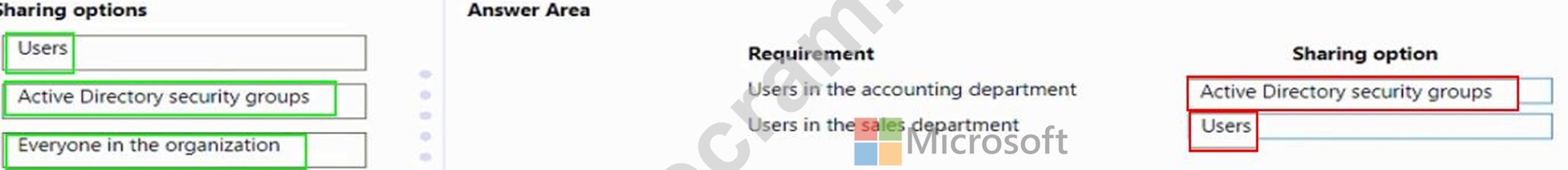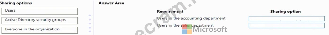 Which sharing options should you use? To answer, drag the appropriate sharing options to the correct requirements. Each sharing option may be used once, more than once, or not at all. You may need to drag the split bar between panes or scroll to view content.