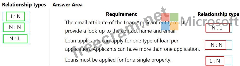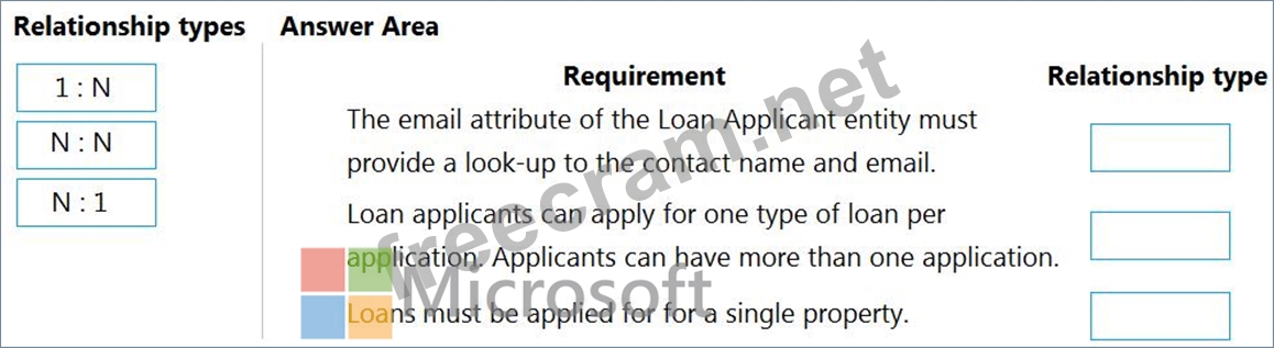 Which relationship types should you use? To answer, drag the appropriate relationship types to the correct requirements. Each relationship type may be used once, more than once, or not at all. You may need to drag the split bar between panes or scroll to view content.