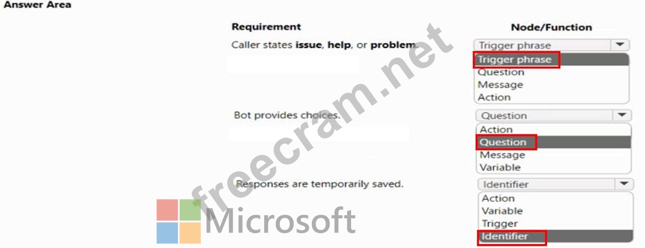 You create topics that contain nodes and functions. The company has the following requirements for the bot: