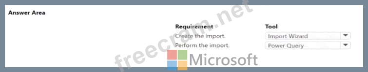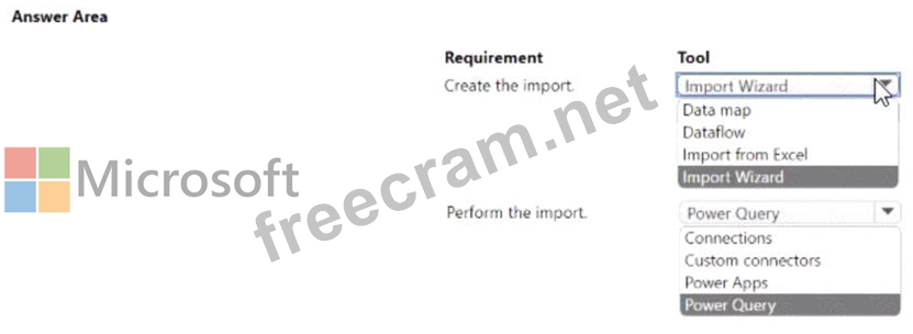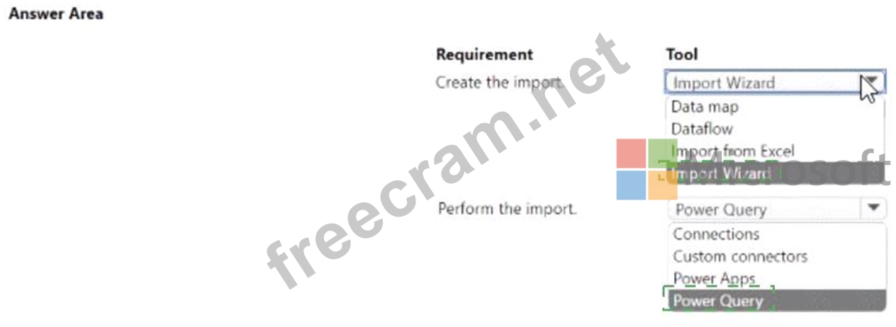 A company uses Dataverse to store the names of contacts. The company uses a shared Microsoft Excel file to collect the data. The company requires that the contacts be added to Dataverse automatically every day You need to identify which tools are required to create and perform the import. What should you use? To answer, select the appropriate options in the answer area.