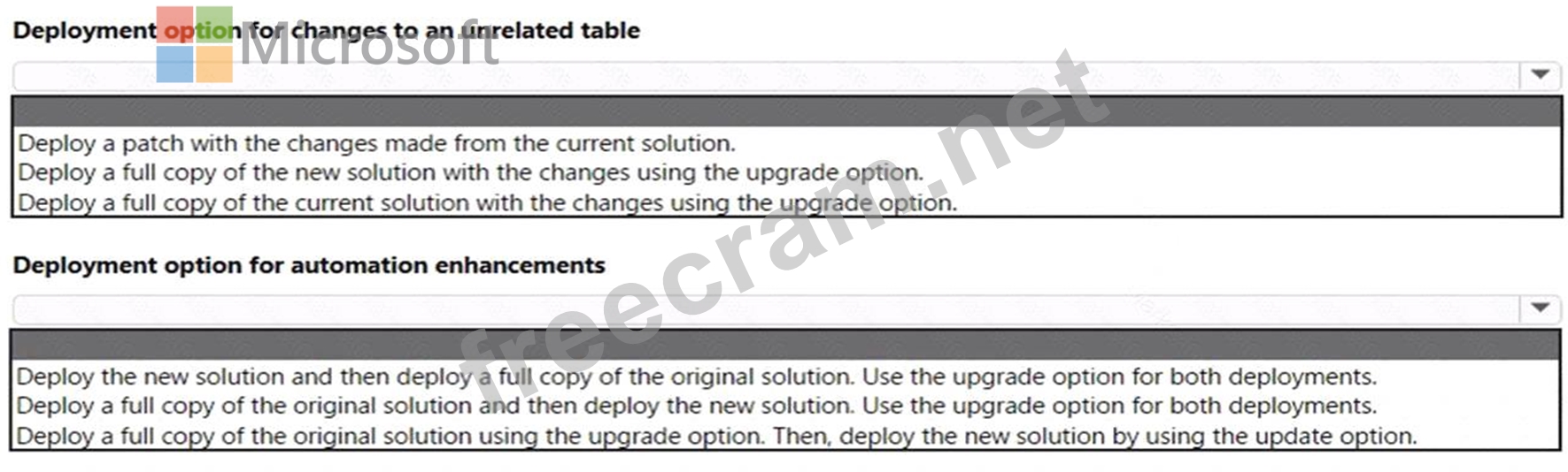 Box 2: Deploy a full copy of the original solution using the upgrade option. Then, deploy the new solution by using the update option.