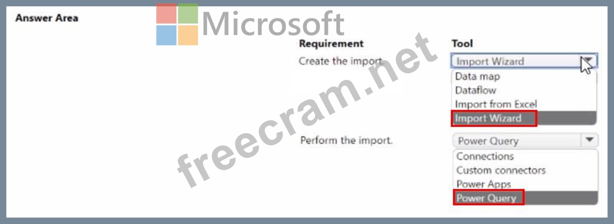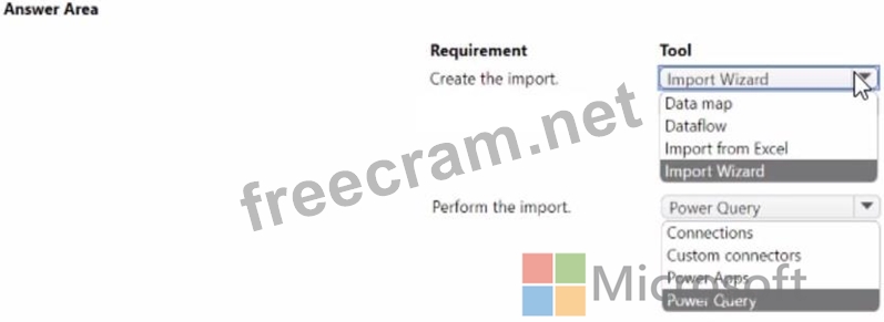 A company uses Dataverse to store the names of contacts. The company uses a shared Microsoft Excel file to collect the dat a. The company requires that the contacts be added to Dataverse automatically every day You need to identify which tools are required to create and perform the import. What should you use? To answer, select the appropriate options in the answer area.