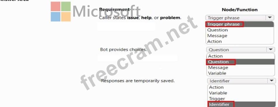 You create topics that contain nodes and functions. The company has the following requirements for the bot: