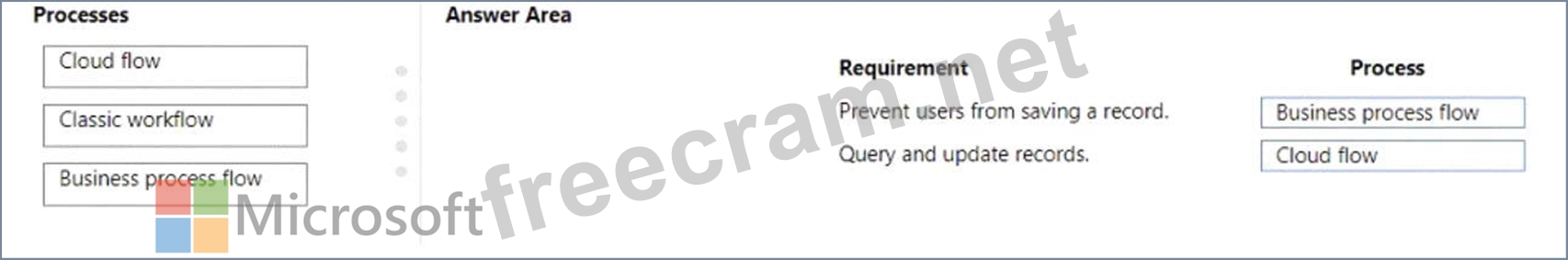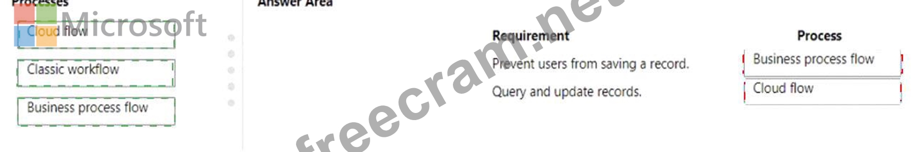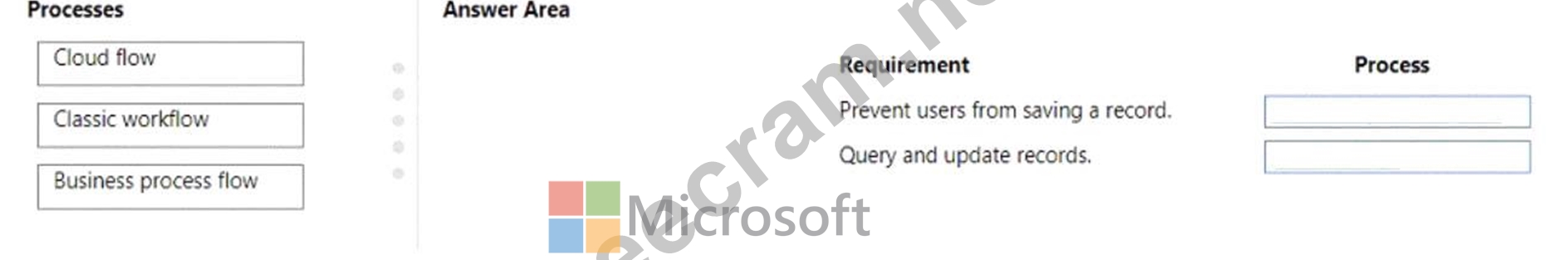 Which processes should you use? To answer, drag the appropriate processes to the correct requirements. Each process may be used once, more than once, or not at all. You may need to drag the split bar between panes or scroll to view content.