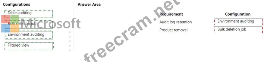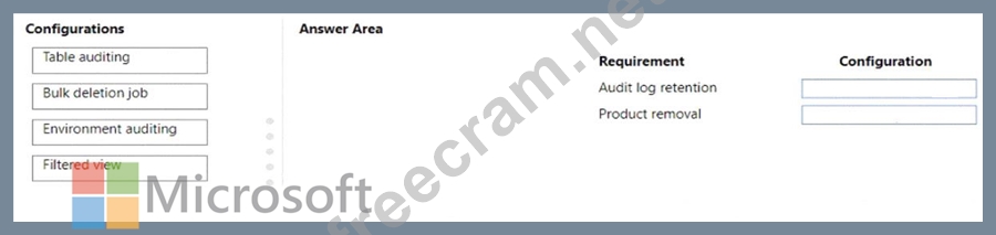What should you configure? To answer, drag the appropriate configurations to the correct requirements. Each configuration may be used once, more than once, or not at all. You may need to drag the split bar between panes or scroll to view content.