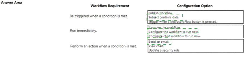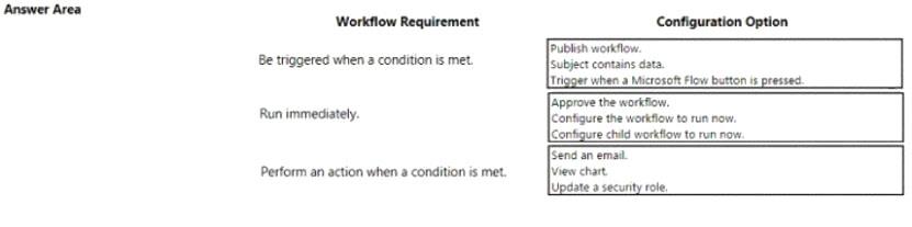You ate a Dynamics 365 Customer Engagement administrator. You create workflows to automate business processes. You need to configure a workflow to meet the following requirements:
