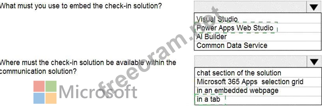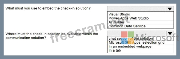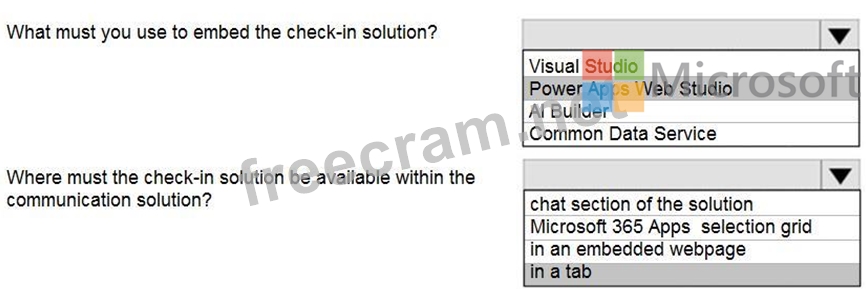 You need to embed the check-in solution into the communication solution. To answer, select the appropriate options in the answer area.