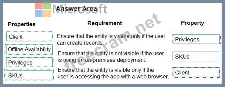 Which properties should you use? To answer, drag the appropriate properties to the correct requirements. Each property may be used once, more than once, or not at all. You may need to drag the split bar between panes or scroll to view content.