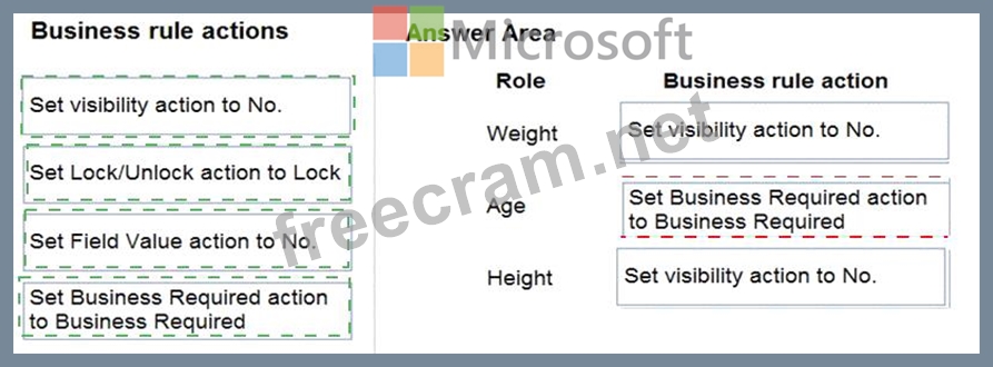 Which business rule actions should you use? To answer, drag the appropriate business rule actions to the correct fields. Each business rule action may be used once, more than once, or not at all. You may need to drag the split bar between panes or scroll to view content.
