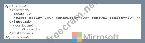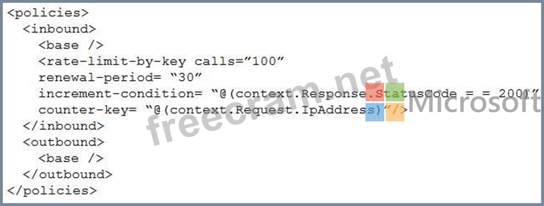 Explanation Scenario: User2 reports that Azure consumption for API calls has increased significantly to 100 calls per minute in the last month. Example: In the following example, the rate limit of 10 calls per 60 seconds is keyed by the caller IP address. After each policy execution, the remaining calls allowed in the time period are stored in the variable remainingCallsPerIP. <policies> <inbound> <base /> <rate-limit-by-key calls="10" renewal-period="60" increment-condition="@(context.Response.StatusCode == 200)" counter-key="@(context.Request.IpAddress)" remaining-calls-variable-name="remainingCallsPerIP"/> </inbound> <outbound> <base /> </outbound> </policies> Note: The rate-limit-by-key policy prevents API usage spikes on a per key basis by limiting the call rate to a specified number per a specified time period. The key can have an arbitrary string value and is typically provided using a policy expression. Optional increment condition can be added to specify which requests should be counted towards the limit. When this call rate is exceeded, the caller receives a 429 Too Many Requests response status code. Reference: https://docs.microsoft.com/en-us/azure/api-management/api-management-access-restriction-policies