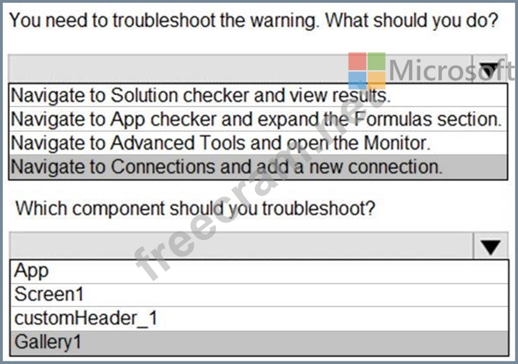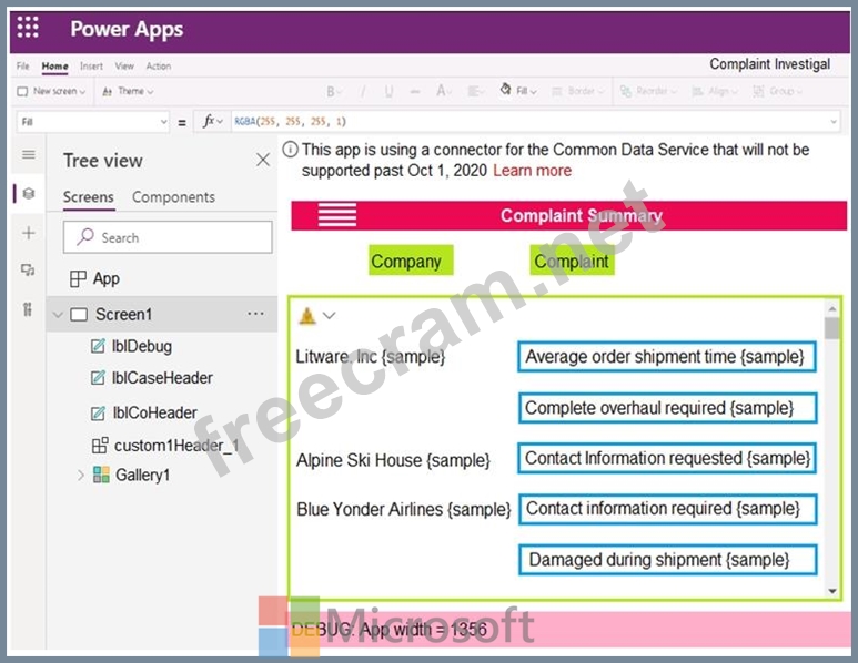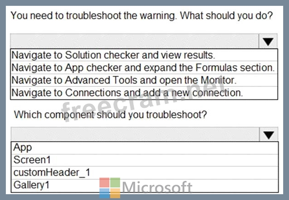 Question 96: A company has a canvas app that has a screen with a gallery ...