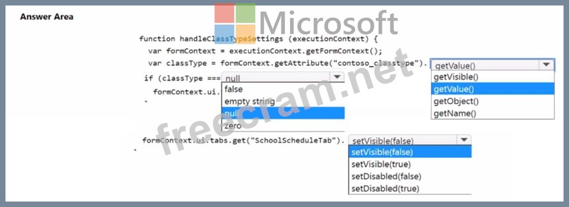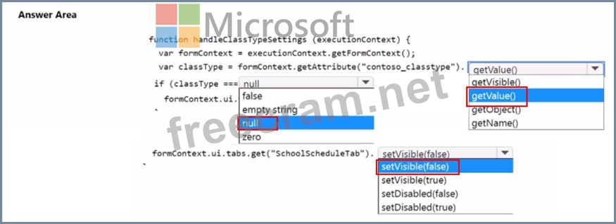 You need to implement client-side logic that uses the Microsoft Dataverse web API to evaluate the class type associated with a class record. The code must hide the School Schedule tab if no value is entered for Class Type.