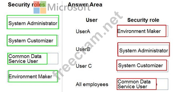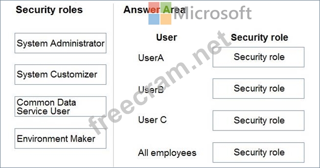 Which security roles should you use? To answer, drag the appropriate security roles to the correct users. Each security role may be used once, more than once, or not at all. You may need to drag the split bar between panes or scroll to view content.
