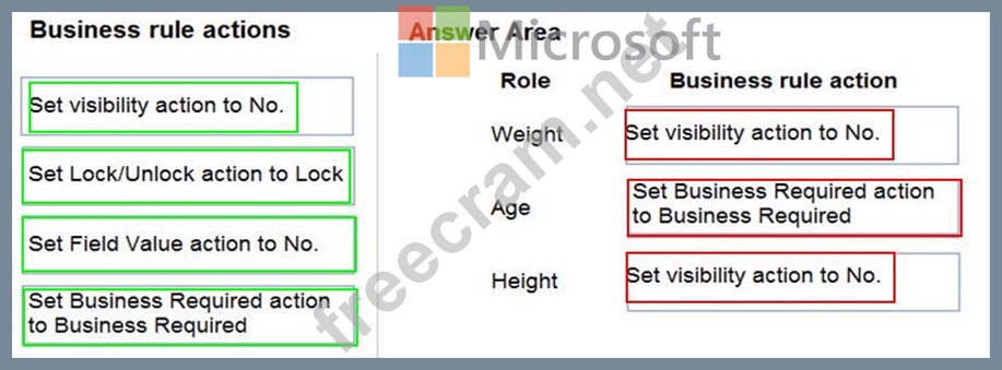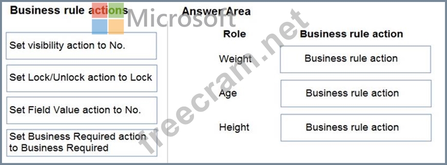 Which business rule actions should you use? To answer, drag the appropriate business rule actions to the correct fields. Each business rule action may be used once, more than once, or not at all. You may need to drag the split bar between panes or scroll to view content.