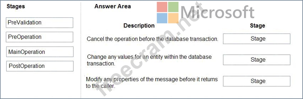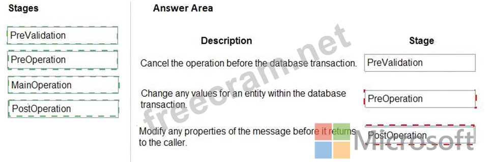 The event pipeline allows you to configure when in the event the plug-in code will execute. The event pipeline is divided into the following events and stages: