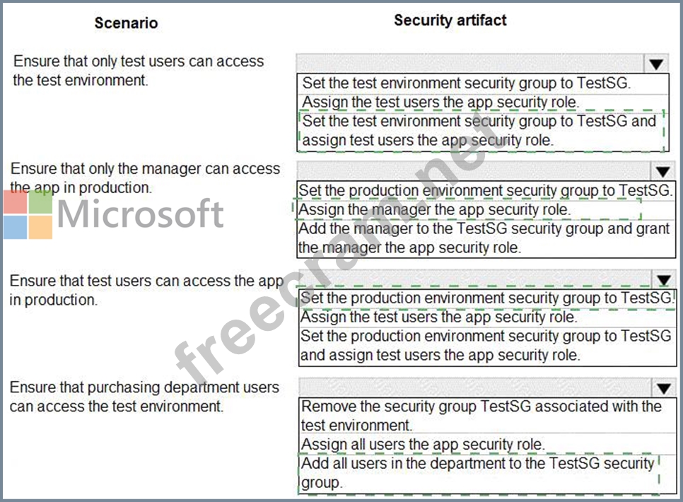 You are developing a model-driven app for the purchasing department of an organization. You provision a new test environment and a security role. You select users to test the apps and assign the users to a security group named TestSG.